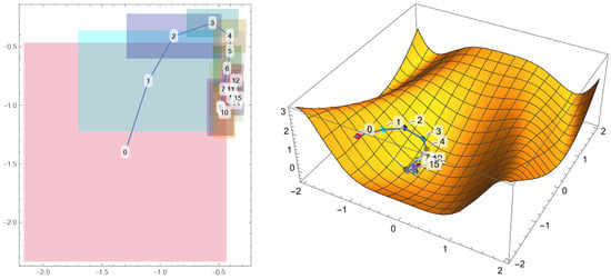 Figure 3. Example of the same Monte Carlo gradient descent implemented on a two-variable function for a schematic visualization. On the left, the numbered boxes indicate the parameter values and the range in which random number generators work. On the right, the same numbered points descend toward the minimum of an example function.