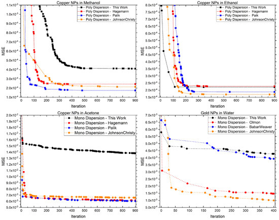Each graph of Figure 4 represents the behavior of four refractive indexes through the algorithm iterations. The fitting of copper NPs produced in methanol and acetone using the copper refractive index evaluated in this work apparently are the worst, even if the obtained refractive index is very close to the literature ones. These discrepancies in terms of final are very low ( for methanol and for acetone) and come from the intrinsic differences of the refractive indexes available in the literature.