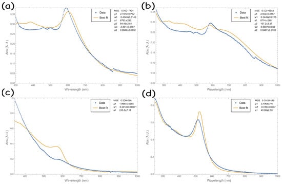 The need to create a versatile instrument that can be easily adapted to every metallic material, changing a few operational parameters, is not expected to produce a perfect fit for several reasons: (i) The starting point is the particle refractive index, but for each material, many different refractive indexes are available in the literature in different wavelength ranges and resolutions as seen in the case of copper in Figure A1 (Appendix A). (ii) A potential layer of coating material (adsorbed solvent, surfactants, oxides, …) is not considered. (iii) Mie scattering theory was used in this work. This theory is related only to spherical particles, while Gans theory provides information on spheroidal particles only in the quasi-static limit. NPs can assume complicated shapes, depending on the production technique, but still, the sphere remains the best approximation. An ideal scenario is the one with spherical particles of the same size, but the reality usually is far away, and the algorithm applied on the spectrum of elongated structures with a high aspect ratio or sharp edges can produce results with no physical significance. (iv) The dielectric correction due to the small size of nanoparticles (Appendix C, Equations (A9) and A10)) is not unique: many are proposed, and the most generic one for a sphere [12] is used. Also, parameters such as the plasma frequency , the electron Fermi velocity , and the electron mean free path are not univocal in the literature for the studied material [12,32,33].