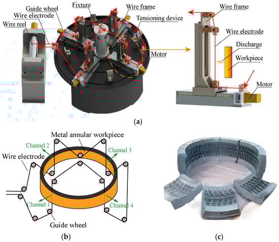 Wire electrical discharge machining (WEDM) is a non-contact machining technique that utilizes thermal erosion caused by spark discharges to process workpieces. Based on the wire running system, WEDM can be classified into two technologies: low-speed WEDM (LSWEDM) and high-speed WEDM (HSWEDM). Due to its ability to process workpieces of any hardness and its high material utilization efficiency, WEDM has become an indispensable technology in industries such as mold manufacturing [1], automobile manufacture [2], biomedicines [3] and aerospace [4]. In some industries, large annular metal workpieces need to be cut into multiple parts according to design specifications, and WEDM is the primary method employed. However, the lengthy cutting cycle has been problematic for enterprises, and increasing the cutting rate of WEDM is the most direct solution. Scholars have explored mechanisms analysis [5], parameter optimization [6], intelligent control [7], and auxiliary processes [8], which have significantly improved the cutting rate of WEDM, although they are approaching their limits.