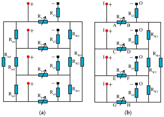 The currents passing through the resistance elements Re1–Re4 are identified as IRe1, IRe2, IRe3, and IRe4, respectively. Equation (4) can be derived by applying Ohm’s law and Kirchhoff’s law of current.