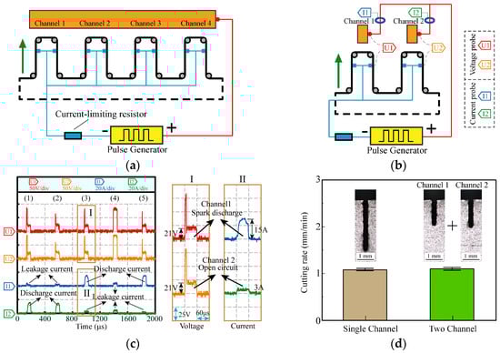 Experiments were performed on single-channel and two-channel HSWEDM machine tools with a conventional power supply to investigate their processing characteristics. The workpiece material used was ASTM1045 steel (Anyang Iron and Steel Group Corporation; Anyang, China), and the processing parameters were set to an open voltage of 90 V, a current-limiting resistance of 5 Ω, a duty cycle of 1/7, a pulse width of 60 μs and a processing time of 3 min. Voltage and current waveforms were recorded during the process, and Figure 3c shows the processing waveforms in five consecutive pulse periods. It can be observed that in the five pulse periods, the voltage waveforms in the two channels are almost identical, while the current waveforms are different. Magnified views of the voltage and current in period 3 are shown in Parts I and II. The voltage of both channels drops rapidly to 21 V in Part I, exhibiting a typical spark discharge waveform [22,23]. However, in Part II, the corresponding current values for channels 1 and 2 in this pulse cycle were 15 A and 3 A, respectively. It is evident that the 15 A current in channel 1 is the discharge current, while the 3 A current in channel 2 is the leakage current. This indicates that spark discharge only occurs in channel 1, while there is no spark discharge in channel 2. During the WEDM process, discharge can take place only when the electric field strength in the gap meets the breakdown field strength of the working medium. Similarly, discharge exclusively takes place in channel 2 during period 1 and period 2. The current in period 4 is indicative of leakage current, implying an open circuit. Subsequently, discharge solely occurs in channel 1 during period 5. Thus, for each pulse period, the discharge occurs in one channel at most. Processing results are displayed in Figure 3d. Cutting rate is defined as the sum total of the feed speed in all machining channels. It can be observed that there are no significant variations in the cutting rate between single-channel and two-channel HSWEDM, maintaining an average of approximately 1.1 mm/min. This indicates that there is almost no improvement of the cutting rate in two-channel HSWEDM. Based on the analysis of processing waveforms, it can be seen that discharge does not occur simultaneously in the two channels within the same pulse period, limiting the improvement of cutting rate and not fully exploiting the advantages of multi-channel HSWEDM.