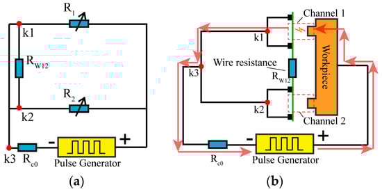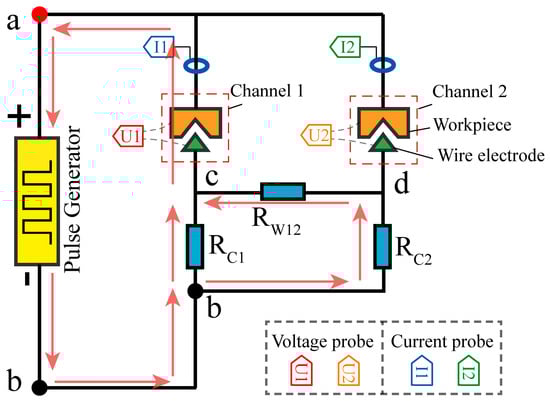 To further unveil the machining mechanism, an analysis of the circuit involved in the machining process was conducted. Figure 4a depicts the equivalent circuit for two-channel HSWEDM with a conventional power supply. Within this circuit, R1 and R2 represent the inter-electrode gap resistances of channel 1 and channel 2, respectively. Rc0 represents the current-limiting resistance. Rw12 denotes the equivalent resistance of the wire electrode between channel 1 and channel 2.