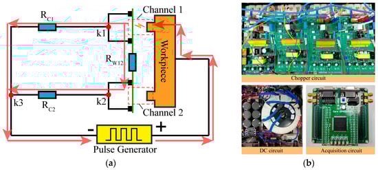The equipotential between electrodes in different channels was discovered to be the basic cause of electrical signal coupling by the analysis in Section 2.2. It is clear that the effective way to accomplish synchronized discharge for multi-channel HSWEDM is to eliminate the equipotential between channels 1 and 2. Therefore, a Multi-Output Pulse (MOP) power supply with a decoupled circuit was designed for use in two-channel HSWEDM. The equivalent circuit is illustrated in Figure 5a, where the former Rc0 from Figure 4b has been divided into Rc1 and Rc2 with identical resistance, connected to k1k3 and k2k3, respectively. When channel 1 discharges, a current loop is formed, as shown by the red arrow. The presence of Rc1, Rc2, and Rw12 causes discrepancies in the potentials at k1 and k2, thereby weakening the electrical coupling between both channels. At this moment, the higher gap voltage provides beneficial discharge conditions for channel 2. The prototype diagram of an MOP power supply is shown in Figure 5b, including a chopper circuit, a DC circuit, and an acquisition circuit.