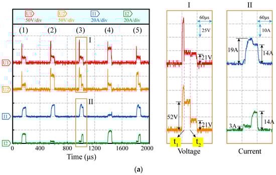 The two-channel HSWEDM experiment was carried out using an MOP power supply to validate the aforementioned theoretical calculations. The processing parameters were configured as follows: an open circuit voltage of 90 V, a current-limiting resistance of 5 Ω, a duty cycle of 1/7 and a pulse width of 60 μs. The processing waveform is shown in Figure 7a, while Parts I and II display magnified views of the voltage and current, respectively, during period 3. In Figure 7b,c, the discharge status diagrams of Part I at times t1 and t2 are presented. The voltage waveforms in different channels exhibit differences, demonstrating the effectiveness of the decoupling circuit in mitigating the interaction between electrical signals in the two channels. Furthermore, based on the current waveforms observed during periods 1, 3, and 5, it is evident that there is a pronounced synchronous discharge phenomenon in both channels, with distinct variations in the current waveforms. Specifically, during period 3, the synchronous discharge process can be described as follows: When the gap of channel 1 breaks down at time t1, the maintenance voltage reduces rapidly to 21 V, and the discharge current reaches 19 A. Due to the decoupling circuit, the gap voltage of channel 2 maintains a high value at 52 V. Subsequently, when the gap of channel 2 breaks down at time t2, the discharge current rises from 3 A to 14 A. The process realizes the synchronous discharge at different channels in one pulse period. The theoretical calculation and experimental results prove that the MOP power supply can decouple the electrical signals in the two channels and realize synchronous discharge, thereby improving the cutting rate of multi-channel HSWEDM of metal workpieces.