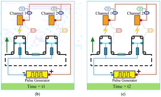To analyze the voltage relationship between the channels, we designed the discharge circuit with the MOP power supply as shown in Figure 6. The red arrow indicates the direction of the current flow. Points A, B, C, and D represent the electric potentials at key nodes in the circuit. When channel 1 experiences breakdown before channel 2, the relationship of voltage in different positions can be obtained according to Kirchhoff’s second law: