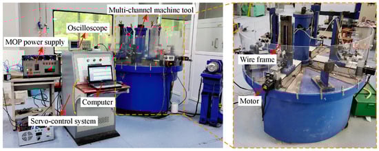 Figure 8 presents the experimental setup of multi-channel HSWEDM. Each channel of the machine tool was equipped with a servo motor, allowing independent control of the feed rate for each channel based on feedback electrical signals. The discharge energy was provided by using either a conventional power supply or an MOP power supply. The power supply was equipped with a signal acquisition module that allows real-time collection of electrical signals during processing, which are fed back to the servo control system and computer. The computer recorded in real-time the various outputs generated by the experiment. The morphology was observed using a laser confocal microscope (OLS4100; Olympus, Japan). During the machining process, voltage and current signals were measured using a four-channel oscilloscope (MDO3104; Tektronix, Beaverton, OR, USA), a voltage probe (TPP0101; Tektronix, Beaverton, OR, USA), and a current probe (TCPA300; Tektronix, Beaverton, OR, USA). In this experiment, the workpiece consisted of multiple ASTM145 steel plates interconnected with copper wires. The specific experimental parameters are presented in Table 1.