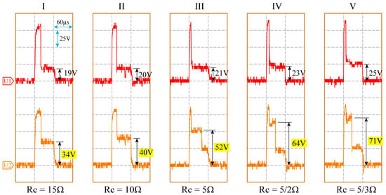 Experiments were conducted under different Rc values, with the experimental parameters presented in Table 1, where Rc1 = Rc2 = Rc. Figure 9 displays the typical waveforms captured during processing with varying Rc values. These waveforms clearly demonstrate that, following the initial breakdown in the gap of channel 1, the gap voltage in channel 2 remains at a relatively high level, measuring 34 V (15 Ω), 40 V (10 Ω), 52 V (5 Ω), 64 V (5/2 Ω), and 71 V (5/3 Ω), respectively. It can be observed that as the Rc value decreases, the gap voltage in the non-breakdown channel increases, making the synchronous discharge process more pronounced.