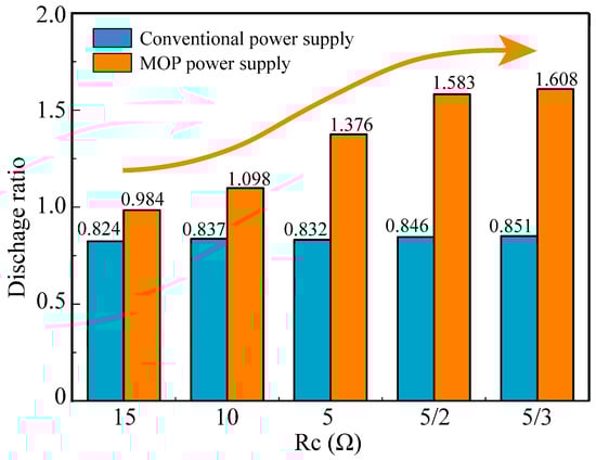 Experiments were conducted to investigate the discharge rate in multi-channel HSEDM using different Rc values. The specific experimental parameters are presented in Table 1. Figure 11 illustrates the discharge ratio of two-channel HSWEDM under different Rc values during continuous processing for 60 s. The discharge ratio is defined as the ratio of the number of discharges in all channels to the number of pulses emitted by the power supply. For the conventional power supply, the discharge ratio remains relatively constant at approximately 0.840, with little variation among different Rc values. However, compared to the conventional power supply, the discharge ratio of the MOP power supply initially increases rapidly and then enters a relatively stable stage as Rc decreases. Specifically, when Rc decreases from 15 Ω to 5/2 Ω, the discharge ratio increases rapidly from 0.984 to 1.583. As Rc further decreases from 5/2 Ω to 5/3 Ω, the discharge ratio gradually increases from 1.583 to 1.608. Combined with the analysis in Section 2.3, it can be inferred that as the value of Rc decreases, the value of K increases, resulting in an increase in Uad, which in turn leads to a higher level of channel decoupling and a significant improvement in the discharge ratio. This observation highlights the ability of the MOP power supply to effectively decouple electrical signals between channels in multi-channel HSWEDM.