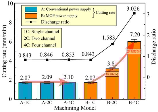 The experiments were carried out with Rc = 5/2 Ω, and the other parameters are shown in Table 1. Figure 12 shows that the cutting rate and discharge ratio under different machining modes. When utilizing a conventional power supply, the discharge ratio remains relatively constant as the number of channels increases, staying at around 0.845. However, the use of the MOP power supply leads to a substantial increase in the discharge ratio with an increasing number of channels, escalating from 0.843 for single-channel HSWEDM to 3.026 for four-channel HSWEDM. The cutting rate demonstrates a strong correlation with the discharge ratio and exhibits a similar trend. In the cutting experiments using a conventional power supply, the cutting rates of single-channel, two-channel, and four-channel HSWEDM are nearly identical, ranging from 2.07 to 2.10 mm/min. On the other hand, using the new power supply, the cutting rate of single-channel HSWEDM is 2.07 mm/min. However, the cutting rates of two-channel and four-channel HSWEDM experience significant improvements, reaching 3.81 mm/min and 7.20 mm/min, respectively. This represents an increase of 84.06% and 247.83%, respectively. This improvement is primarily attributed to the MOP power supply reducing the degree of electrical signal coupling between channels, enabling synchronous discharge and enhancing the discharge ratio of multi-channel HSWEDM, thereby greatly improving the cutting rate.