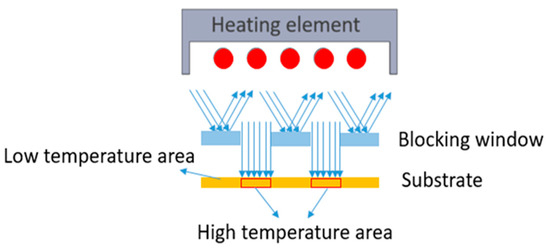 The principle of this method is to place a heat mask between the heat source and substrate. To accomplish this, we modified our thermoforming machine as depicted in Figure 1. The non-heated and thus non-stretchable regions of the substrate (indicated as “low temperature area” in Figure 1) are bendable and can accommodate the mold shape during forming; the exposed region of the substrate (indicated as “high temperature area” in Figure 1) will reach the glass transition temperature (glass transition temperature of the polycarbonate is around 147 °C) and can be stretched to accommodate to a non-developable mold shape. In order to achieve this selectivity, we have used a laser structured metallic mask plate (blocking window) to block heat (IR radiation) in specific areas and allow the heat to expose the substrate in other parts. In the set up depicted in Figure 1, there are two openings in the mask that can allow radiation to go through and expose the substrate to this radiation.
