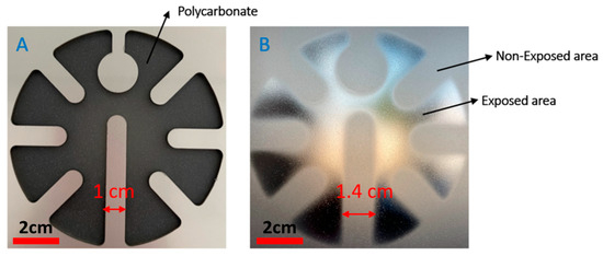 (A) The heat-blocking mask made in aluminum, (B) polycarbonate which has been exposed to IR radiation.