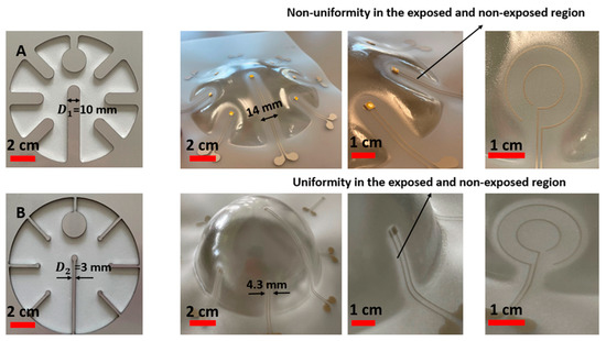 We have used two different strip widths in the masks (i.e., ). In Figure 4, it can be seen that when a larger strip in the mask is used, some non-uniformity is present in the thermoformed sample, but when a smaller strip is used, there is no non-uniformity (e.g., in case A the thermoformed shape does not follow the shape of the mold, in case B it does). This method cannot provide a sharp transition between fully exposed and completely non-exposed areas. There is a gradual spatial change in absorbed heat, extending over several mm. The designs in Figure 4A,B seek to explore the limits of the spatial frequency or width of a non-exposed line which can be achieved. We have proven that a width of 3 mm of the metal heat mask still results in shielding the substrate from exposure to heating. As a result, we have used the optimized strip width ( = 3 mm) for the rest of the experiment.