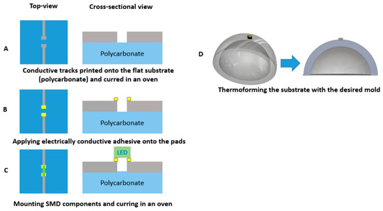 Fabrication process: (A) Printing conductive traces onto the flat substrate using ME614 and putting in the oven (90 °C) for 20 min. (B) Applying electrically conductive adhesive (LOCTITE CE 3103WLV)) onto the pads. (C) Mounting SMD components in putting in oven (120 °C) for 30 min. (D) Thermoforming the substrate with the desired mold (cross-sectional view).