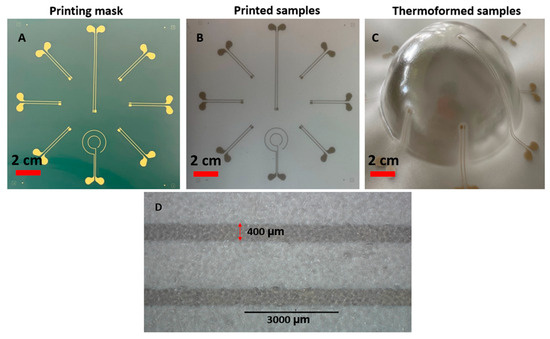 (A) Screen mask. (B) Printing result on the polycarbonate substrate using ME614 as the conductive ink. (C) Thermoforming result by using a semi-sphere mold with 60% elongation. (D) detailed view of 2 printed tracks (darker grey) after thermoforming.