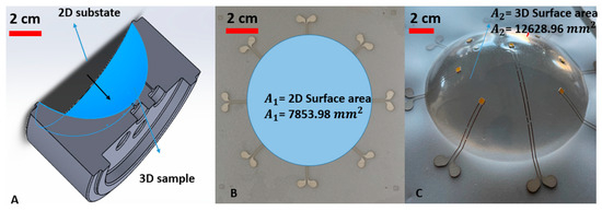 (A) A cross-sectional view of the 2D substrate and 3D sample surface area. (B) The 2D surface region in the substrate that is heated and formed. (C) The 3D surface area after thermoforming.