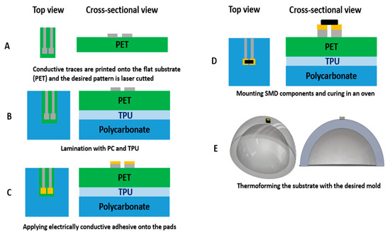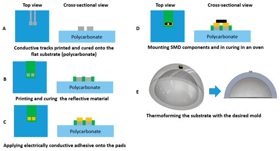 Fabrication process: (A) Printing conductive traces onto the flat substrate using ME614 and curing in the air convection oven at 90 °C for 20 min. (B) Printing the reflective layer (non-conductive mirror (Pröll GmbH) and curing in the oven 90 °C for 20 min. (C) Applying electrically conductive adhesive (LOCTITE CE 3103WLV)) onto the pads. (D) Mounting SMD components and curing in the oven at 120 °C for 30 min. (E) Thermoforming the substrate with the desired mold.