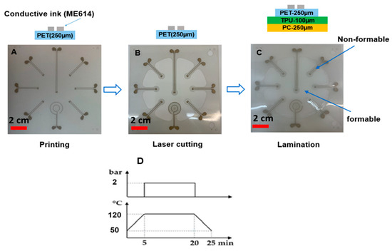 (A) Printing the conductive track on PET by using screen printing. (B) Laser cutting the printed sample to make the non-stretchable parts. (C) Lamination of the PET substrate with polycarbonate and TPU to make a thermoformable stack. (D) The lamination profile.