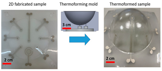 Over several years, 3D-shaped electronics have become more popular, finding multiple applications in manufacturing, home appliances, and the car industry. A number of methods, including in-mold electronic technology (IME) [1,2,3,4,5,6,7], stretchable mold interconnect (SMI) [8,9,10,11,12,13], and 3D-MID [14], can be used to produce curve-shaped electronics. IME is a technique that combines conventional plastic molding with printed conductive inks that are flexible or even elastic on plastic surfaces. For SMI technology, the 3D form is made possible by using thermoforming and flexible metal conductors. Commonly utilized procedures like copper plating and laser cutting are used in the 3D-MID method. Vanfleteren, J. et al., examined and compared three techniques; their outcomes are discussed in [15]. During thermoforming in SMI and IME technology, the spatial position of the components is difficult to control. Due to the complicated deformation of 2D substrates caused by thermoforming, implementing a repeatable process is extremely challenging. The electrical components in thermoformable electronics can be positioned using the “Degrees of freedom” methodology, according to a patent application by Vanfleteren, J. Using this method, the meandering will only direct the component in one possible spatial position [16]. Gong, Y. researched resistance changes depending on printed circuit deformation during thermoforming. To explain the association between deformation and the electrical resistance of the circuit, a regression model is developed. The deformation of the printed circuit is measured experimentally and statistically. Following this, a theoretical analysis is conducted based on numerical findings and a regression model to determine the electrical resistance distribution of the circuit following the thermoforming process. Both experimentally and numerically, the impact of geometrical parameters is also studied [17]. Ting, J et al., developed software with Microsoft that allows users to map 2D data into 3D space, design electrical circuits and structural models, and interact with the software [18]. The paper utilized mathematical mapping to convert 2D-generated circuits into 3D forms. It is possible to interactively view the updated position of the component in 3D by changing its position in 2D. Research in this area only examined the problem mathematically, disregarding the physics of thermoforming. A new 3D fabrication technique, developed by Choi, J., is adaptable, conformable, and stretchable. This technique is based on predistorted patterns and thermoforming. Using this technique, thermoforming is used to create custom-designed 3DE. Because the thermoforming method makes it possible to completely replicate both the overall shape and the surface texture of the 3D mold, the manufactured 3DE has great 3D conformability. A thermoplastic elastomer and a conductive electrode with a liquid metal base contribute to the device’s high thermoformability and stretchability during operation [19]. A study by Schirmer, J. evaluated the mechanical stress that is imposed on electronic assemblies during thermoforming and injection molding for conformable electronics. It has been shown using microscopic images that cracks may form near components after thermoforming [20]. Steven I. Rich presented a shrink-based paradigm to apply thin-film electronics to non-developable surfaces [21]. Steven I. Rich has reviewed all recent possible fabrication approaches for fabricating electronics on curved surfaces, e.g., substrate-mounted methods, aided patterning, fully 3D techniques [22]. Beltrão, M. reviewed the state of the art of IME technology, resorting to the scientific research work performed and its main outputs, compiling and analyzing the main knowledge and achievements on the process to date [6]. Goument, C. represented a solution to replace polycarbonate (PC) with poly(lactic acid) (PLA), a biosourced and biodegradable polymer to reduce the environmental impact of IME manufacturing. The thermal and mechanical properties of the PLA materials are investigated to optimize the IME process parameters and to take into account the glass transition temperature Tg around 55–60 °C of PLA [23]. Lall, P. investigated a significant design challenge, as the over-deformation of printed circuits can lead to a poor performance and reliability issues. This study has introduced new design strategies and methods to optimize the performance of the IME process. This includes the use of electrically conductive adhesives to attach components in their undeformed state and later subject them to thermoforming. This approach helps to maintain the integrity of the printed circuit and improve the performance of the interconnects [24].