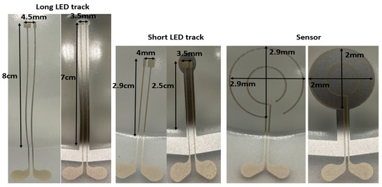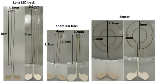 In this experiment, we have used the mold with 60% elongation (same as in the first methodology). The measurement results are shown in Figure 14 and Table 6. By contrast, the tracks and pads do not deform or expand when we use the proposed fabrication method with the PET support. In addition, the sensor shape remains the same as it was in the 2D design. Table 6 demonstrates that by using our proposed approach all the dimensions of the tracks, pads, and sensors are equal to the 2D design, which proves that our approach is a repeatable process for the fabrication of thermoformed electronics. In our proposed method, the conductive tracks are still conductive for obvious reasons (there is no stretching in the tracks, there is just bending to accommodate the curved shape). In the new approach, the change in the average resistance before and after thermoforming is very small (i.e., 0.09 Ω), as shown in Table 7.