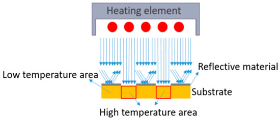 Typically, in the thermoforming process, the entire substrate is irradiated with light (e.g., with IR or other wavelengths) to be heated up to about the glass transition temperature to make the substrate non-resistant to deformation. Here, we have evaluated printing a reflective material on the substrate to selectively heat the substrate, as IR heat will be reflected. The difference in absorption causes the buildup of a differential temperature profile in the thermoplastic material along a surface coordinate of the substrate. Therefore, the regions with the printed reflective material can maintain a lower temperature than the surrounding area without this printed layer. At the time of the deformation process, the thermoplastic material at non-printed areas may have a relatively high temperature (i.e., above the glass transition temperature) to provide a relatively low resistance to the deformation process while the thermoplastic material at the printed parts has a relatively low temperature, (i.e., below the glass transition temperature) and provides a relatively high resistance to the deformation process. Figure 15 depicts how we can selectively heat the substrate.