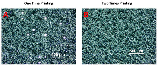 (A) The result of printed layer after one-time printing. (B) The result of the printed layer after two-times printing.