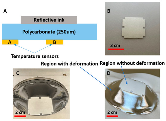 (A) Cross-sectional view of the printed stack. (B) The reflective material printed on the substrate. (C) The sample after being irradiated in the thermoforming machine. (D) The sample after being irradiated and removed from the thermoforming machine, in which it is apparent that in the region where a reflective layer is printed, there is no deformation as a result of the low temperature (the deformation in (C,D) is caused only by gravity, not by applying a vacuum and a forming mold).