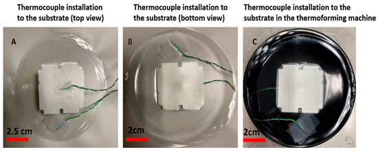 (A) Thermocouple installation to the substrate (top view). (B) Thermocouple installation to the substrate (bottom view). (C) Thermocouple installation to the substrate in the thermoforming machine.