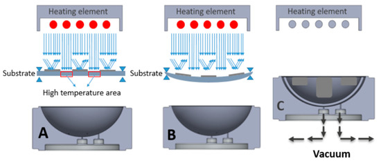 The effects of printing a reflective layer on the substrate on light absorption in the thermoforming process. (A) Heating process, (B) Starting the vacuum, (C) Thermoforming.