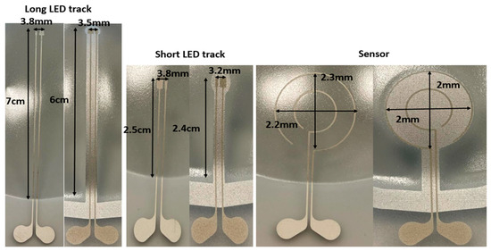 In the first experiment, we have used a 60% elongation mold to thermoform the fabricated 2D stack. For the first set of samples, we have selectively irradiated the substrate by using the heat mask with the narrow (3 mm-wide) strips (Figure 4B), but for the second set of samples we have illuminated the whole region of the 2D substrate (no heat mask used) and we compared the results in Figure 8 and Table 3. As it is obvious from the comparison in Figure 8, when there is no heat mask used, the tracks are randomly stretched and they are not even in a direct path (i.e., straight lines are thermoformed to non-straight lines). There is also a big deformation of the shape of the sensor, in such a way that it is deformed differently in different directions. The pads of the components show a small amount of expansion (Figure 8). Furthermore, when no heat mask is used, there is no electrical connection between the powering pads and the LED’s tracks, because micro cracks in the ink appear which are caused by excessive stretching during thermoforming (Figure 10). For samples where a heat mask was used during the heating phase of the thermoforming, there is no deformation and expansion in the tracks and in the pads. Furthermore, the shape of the sensor is identical to the 2D design. The electrical conductivity of the tracks before and after thermoforming for both methods is depicted in Table 5. The average resistance before thermoforming is 5.67 Ω and after thermoforming 6.36 Ω. As can be observed, the tracks remain conductive for the method using a heat mask. Regarding accuracy of component position, in Table 3 we show that the dimensional properties of the polycarbonate in the heat-shielded areas remain the same as before thermoforming. As a result, the length of those non-exposed parts remains unchanged and can thus be used for accurate component positioning.