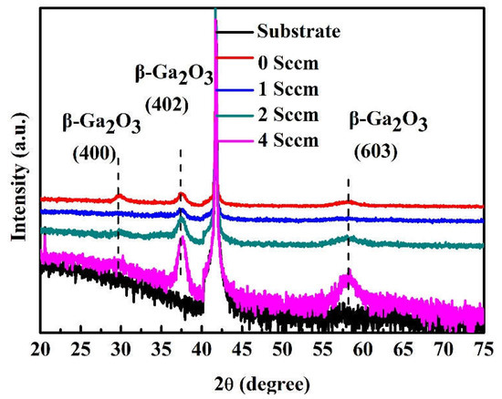 Figure 1 shows the result of the X-ray diffraction of the Ga2O3 films growth with various O2 flow rates. The diffraction peaks located at 29.7°, 37.6°, and 58.4° originate from the 400, 402, and 603 of the β-Ga2O3, respectively [1,25,26]. For the sample without the O2 flow rate, 400, 402, and 603 of the β-Ga2O3 diffraction peak coexisted; this suggests that the sample was polycrystalline. With the O2 flow rate increased from 0 to 4 sccm, the diffraction peak intensity of the 400 β-Ga2O3 decreased, while the intensity of both the 402 and 603 of β-Ga2O3 diffraction peak increased. Both of these two diffractions belong to the 201 plane family of the monoclinic Ga2O3 [27,28]. The above result illustrates that highly 201-textured β-Ga2O3 samples have been prepared and the orientation of crystal is gradually enhanced when oxygen flow increased. Furthermore, the full width at half maximum (FWHM) values of the 402 β-Ga2O3 peaks are 1.00°, 1.10°, 1.06°, and 0.96° for samples with the O2 flow rate increased from 0 to 4 sccm, respectively. The FWHM value is dependent on the O2 flow rate, and the results suggest a higher O2 flow rate results in improved crystal quality. The minimal FWHM is obtained at 4 sccm of the O2 flow rate, which means the grain size is the largest [29]. The combined results of the XRD peak intensity and the FWHM value of the samples show that higher O2 flow rates lead to better quality.