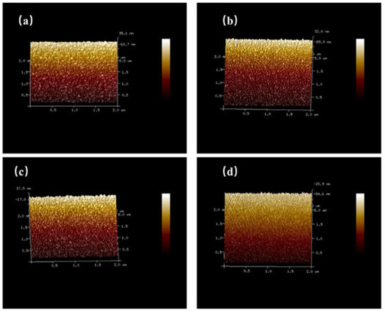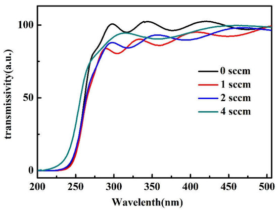 The transmission spectrum of the sample is shown in Figure 5. All the sample’s transmissibility is over 75% and has interference fringes, indicating the existence of a smooth surface. As the O2 flow increases from 0 to 1 sccm, the transmittance of the sample decreases rapidly. With the increase in oxygen flow from 1 to 4 sccm, the transmittance of the sample increases gradually. The results of transmission spectrum and crystal mass can confirm each other; with the rise of O2 flow rates, the crystal mass of the sample decreases first and then increases, and the transmission spectrum also shows the same rule. In addition, the band gap of the sample becomes widened when the oxygen flow increases from 1 to 4 sccm.