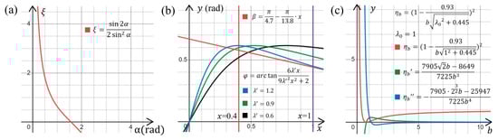 Relationship analysis for propeller parameter selection (see key legends for parameter expressions and settings): (a) between ξ and α; (b) between φ, α, and β; (c) between b and ηb.