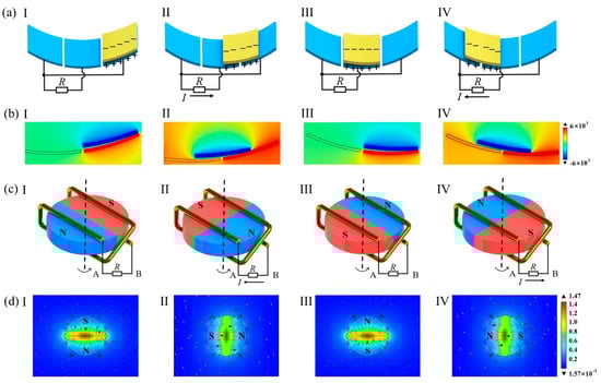 LSWS-TEH operating principle and simulation results: (aI) working schematic of the TENG state 1; (aII) working schematic of the TENG state 2; (aIII) working schematic of the TENG state 3; (aIV) working schematic of the TENG state 4; (bI) simulation of the surface electric potential distribution of the TENG state 1; (bII) simulation of the surface electric potential distribution of the TENG state 2; (bIII) simulation of the surface electric potential distribution of the TENG state 3; (bIV) simulation of the surface electric potential distribution of the TENG state 4; (cI) working schematic of the EMG state 1; (cII) working schematic of the EMG state 2; (cIII) working schematic of the EMG state 3; (cIV) working schematic of the EMG state 4; (dI) simulation of the surface flux density of the EMG state 1; (dII) simulation of the surface flux density of the EMG state 2; (dIII) simulation of the surface flux density of the EMG state 3; (dIV) simulation of the surface flux density of the EMG state 4.
