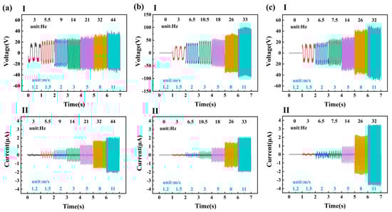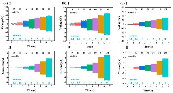 Open-circuit voltage and short-circuit current produced by the TENG for different strip lengths of PTFE film: (aI) open-circuit voltage of TENG in 3 cm film; (aII) short-circuit current of TENG in 3 cm film; (bI) open-circuit voltage of TENG in 4 cm film; (bII) short-circuit current of TENG in 4 cm film; (cI) open-circuit voltage of TENG in 5 cm film; (cII) short-circuit current of TENG in 5 cm film.