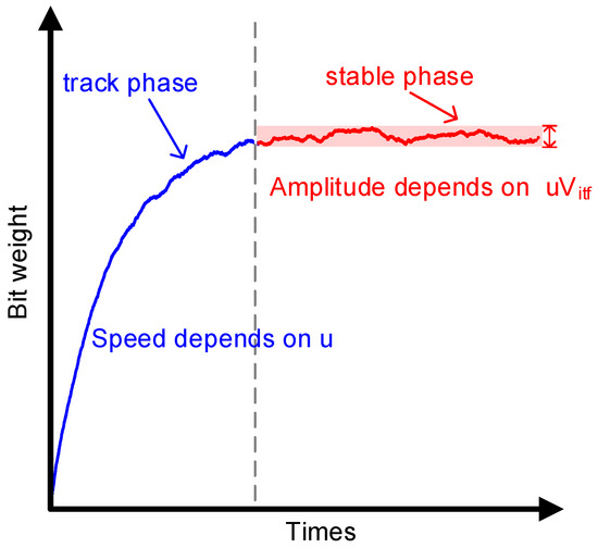 where denotes the learning step. Figure 3 shows the learning curve of including two phases, track phase and stable phase. In the track phase, since the average value of Vitf is 0, is the only factor that determines the convergence speed. During the stable phase, fluctuates and the fluctuation’s amplitude depends on μ Vitf, which deteriorates the ADC performance. Therefore, to not degrade the ADC performance and accelerate convergence, μ Vitf should decrease while u increases, which requires Vitf during the stable phase to be removed. The 2nd part of Vitf in (4) can be easily obtained, whereas the 1st part, which is the product of GR and the residue of Vin after 5 conversions, is not available. Sub-ADC is used to quantize the residue, and we can obtain