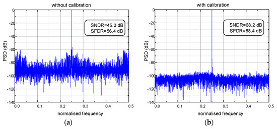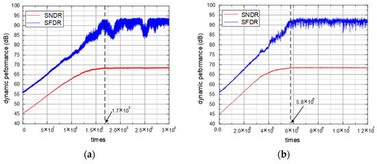 To demonstrate the effectiveness of the proposed calibration algorithm, the full-scale sine wave input is simulated to observe the dynamic performance. One of the output spectra without and with calibration is shown in Figure 4. After calibration, SNDR and SFDR improve from 45.3 dB and 56.4 dB to 68.2 dB and 88.4 dB, respectively. Without and with signal elimination, simulations are executed with the same mismatch, and the dynamic performance learning curves are shown in Figure 5.