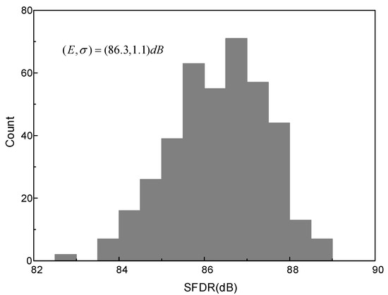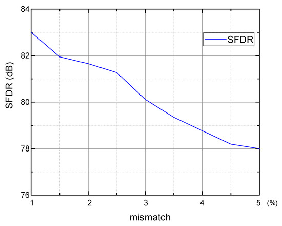 To evaluate the effect of the sub-ADC 5 MSBs’ capacitor mismatch to the signal cancellation, 400-time Monte Carlo simulations are performed with σ = 1% unit capacitor mismatch. The output spectra after convergence (5.8 × 106 cycles) are statistically analyzed. Figure 7 shows the SFDR distribution histogram with the mean value E of 86.3 dB and standard variation σ of 1.1 dB, while SNDR is 68 dB and hardly changes, thus, it is not shown in Figure 7. The unit capacitor’s mismatch changes from 1% to 5%, and each case is simulated 1000 times. Figure 8 shows the worst case in 3σ principle, i.e., E−3σ, of SFDR. With 1% mismatch, SFDR is 83.0 dB, while it is 78.0 dB with 5% mismatch, which still maintains good calibration effect. A 5% mismatch is easily achieved in most processes, and, thus, the mismatch of the sub-ADC’s 5 MSBs does not limit the convergence acceleration.