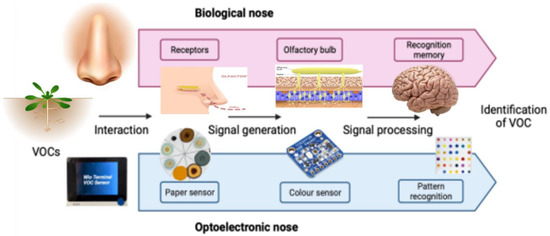 The limitations observed in electrochemical and optical sensors could potentially be addressed by the combination of multiple low-cost devices in the form of electronic noses. Electronic noses, or e-noses, are devices capable of sensing odours by mimicking the human olfaction system. These systems incorporate multiple sensors with varying selectivities and sensitivities, which can be used to profile complex gas mixtures. In this case, gases react with each sensor contained in the e-nose to trigger a distinct signal change. In typical metal-oxide based sensors, the increase in gas concentrations leads to a change in electrical resistance, which can be determined by the output voltage. However, electronic noses often require complex circuit assembly, involving metal oxides with heating elements, and printed circuit boards, and often, they cannot be easily modified for the tailored detection of new biomarkers. As such, despite the wide range of commercially available sensing devices, the flexibility of such systems to be adapted for specific applications such as plant stress monitoring is limited. Furthermore, complex manufacturing processes lead to the relatively high costs of these devices, in the range of USD 200 [12], and they generally require specialised personnel to assemble the devices and analyse the results.