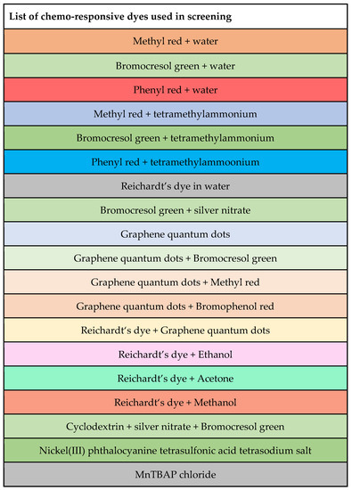 Solutions containing multiple colorimetric dyes with proven performance for gas detection, as well as combinations of dyes with different solvents and matrices, were tested. In each case, the dye solutions were prepared by mixing 5 mM of each dye in 1.5 mL Eppendorf tubes. To lower manufacturing costs, disposable sensors were produced by deposition of multiple dyes onto filter paper by drop casting. Filter paper was cut into circular pieces with a diameter of about 5.5 cm and the space was divided into 8 sections of equal size. On each of the 8 sections, 20 µL of dye was drop-casted, which formed a coloured spot of about 1–2 cm diameter. The manufacturing process of these sensors was fast and took less than one minute per sensor paper. To ensure low interference from solvent residues, each multiplexed sensing paper was left to dry for at least 4 h. A list of reactive dye combinations used in this study is provided in Figure 2. These dyes were combined with different solvents, as well as analyte-binding compounds such as cyclodextrin (CD), to tune the selectivity of the reactions.
