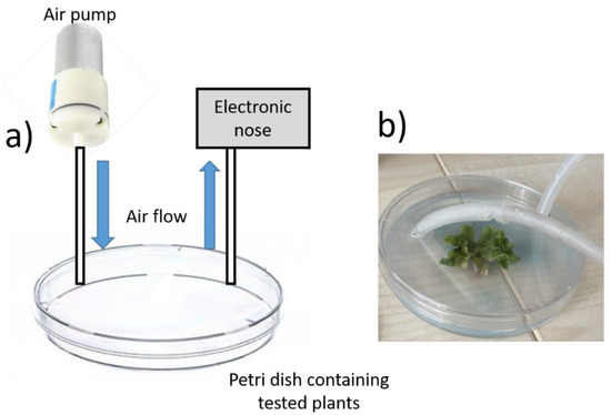 (a). Schematic representation of the setup used for sampling plant VOCs in Petri dishes with an electronic nose. Holes were inserted into Petri dish lids to access the interior air space, with tubes for connecting an air pump and to allow access to the electronic nose. An air flow was then established using an air pump to drive volatiles towards the electronic nose. (b). Real picture of the final setup, incorporating the tubes for the real-time measurement of plant volatiles.