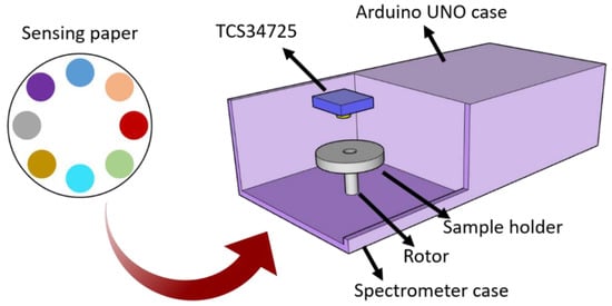 Schematic representation of the spectrometer device developed in this study for the determination of colorimetric changes in sensing papers. These papers, containing multiple chemo-responsive dyes, were characterised using a low-cost TCS34725 spectrometer, and the process was automated using a motorised rotor.