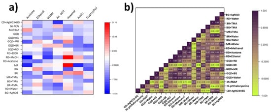 (a). Heatmap representation of the sensitivity of dye combinations towards each organic volatile studied in this work. (b). Correlation matrix between the performance of each dye against the studied gases. Darker colours indicate a higher correlation.
