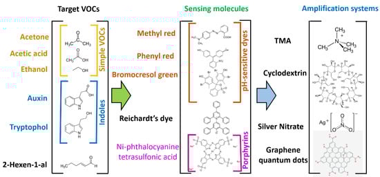 Schematic representation of compounds tested during the screening of dye compositions for volatile detection. The different dyes employed and signal amplification systems to enhance the selectivity are also indicated. These combinations of dyes allowed profiling of plant abiotic stress biomarkers.