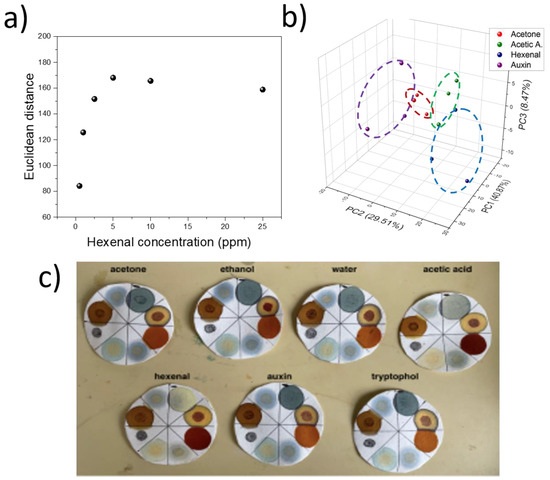 The first step in fabrication of the sensing devices consisted of the selection of a combination of suitable dyes and sensing compositions. Optoelectronic noses typically involve chromogenic indicators, able to change the emitted light within the visible range [18]. In this case, four different chromogenic dyes were employed with a proven performance in volatile detection: bromocresol green (BG), methyl red (MR), bromophenol red (BR), and Reichardt’s dye (RD). These dyes could produce a measurable change within the visible spectrum upon exposure to organic volatiles that could be determined using a low-cost spectrometer. In all cases, red, blue, and green signals (corresponding to wavelengths 575, 535, and 445 nm, respectively) were measured using our low-cost TCS34725 spectrometer device. The responses towards multiple volatiles, including acetone, acetic acid, ethanol, water, 2-hexen-1-al, tryptophol, and auxins, were then determined. The results from the initial screening are shown in Figure 5a. In this case, the differences between the three-dimensional Euclidean distance of the control, not exposed to the target gas, and the one achieved on exposure to each gas was calculated. This value of Euclidean distance difference was used to determine the sensitivity of the dyes, since it provided information about the total magnitude change in colouration.