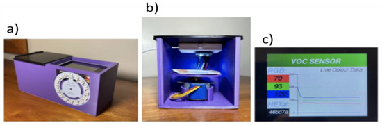 The results obtained with the low-cost spectrometer showed a good performance in the identification and detection of the early signs of stress in plants, even allowing a detection of 2-hexen-1-al on the sub-ppm level. However, measurements showed variability in some cases due to some environmental factors, including background light intensity. To minimise the impact of the environment on the accuracy of detection while enabling automation of the data measurement process, a 3D printed spectrometer was designed. This spectrometer comprised a case with sliding lids, a rotor to move between each of the eight dye samples, and a Wio terminal (Figure 11a,b). The Wio terminal could display the numerical values of colour measurements from the optoelectronic noses in real time. Specifically, it showed the colour data in a graph and as numerical RGB values, as well as the HEX code of each colour (Figure 11c). This spectrometer could potentially be adapted to any number of dyes or sensor configurations, and could also be potentially interfaced with machine learning algorithms and wireless communication for IoT applications. The low-cost of this device combined with the easy operation could enable the use of this device by a wide community of farmers, horticulturists, and gardeners.