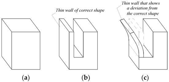 Suppose it is necessary to machine a groove in a parallelepiped-form workpiece (Figure 1a) by milling with a disk cutter, resulting in a thin wall (Figure 1b). For smaller thicknesses t of the thin wall, the mode of action of the milling teeth and the forces generated during milling could lead to a residual deformation of the thin wall generated by milling, as seen in Figure 1c.