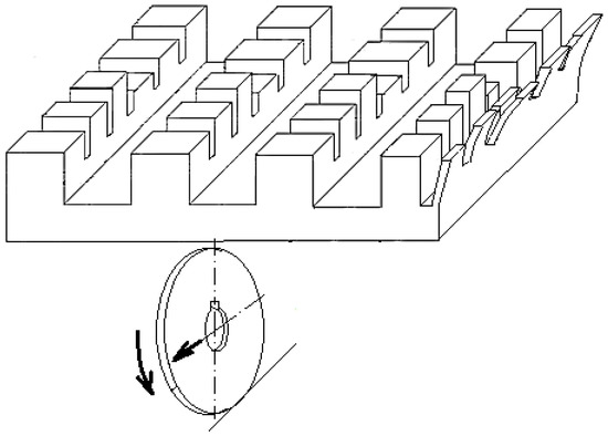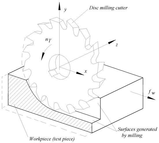 A cutting scheme corresponding to the groove and thin wall generation mode can be seen in Figure 2. The disc cutter will rotate with speed nT, while the workpiece will make a feed movement fw. So-called feed milling is preferred, resulting in a common direction of the vectors corresponding to the cutting speed and feed speed in the area of contact between the disc cutter and the workpiece material.