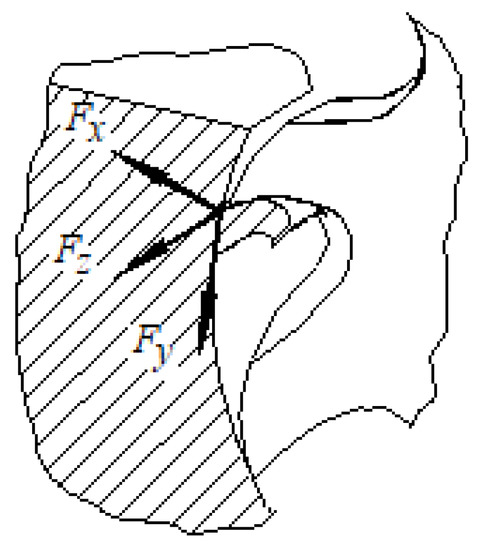 Considering an xyz-coordinate system attached to the tool at the level of the contact area of the cutting tooth with the workpiece material (Figure 3), the total cutting force is decomposed into three components, Fx, Fy, and Fz, as can be seen in Figure 3. In this case, the Fz component of the cutting force will tend to deform the thin wall towards the outside of the workpiece. If the thin wall is nevertheless sufficiently thick, and has, therefore, a high stiffness, and the Fz component has a small size, only an elastic deformation will develop that will not manifest in a deviation of the wall from its correct form (Figure 1b).