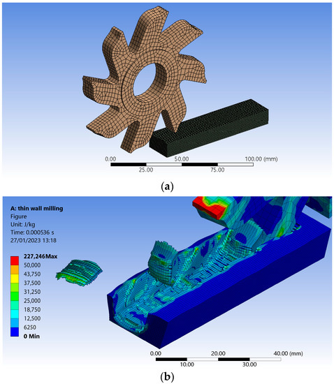 Highlighting using the finite element method: (a) the mesh specific to the disc cutter and the workpiece; (b) the energy transferred to the surface layer generated by milling with a disc cutter.